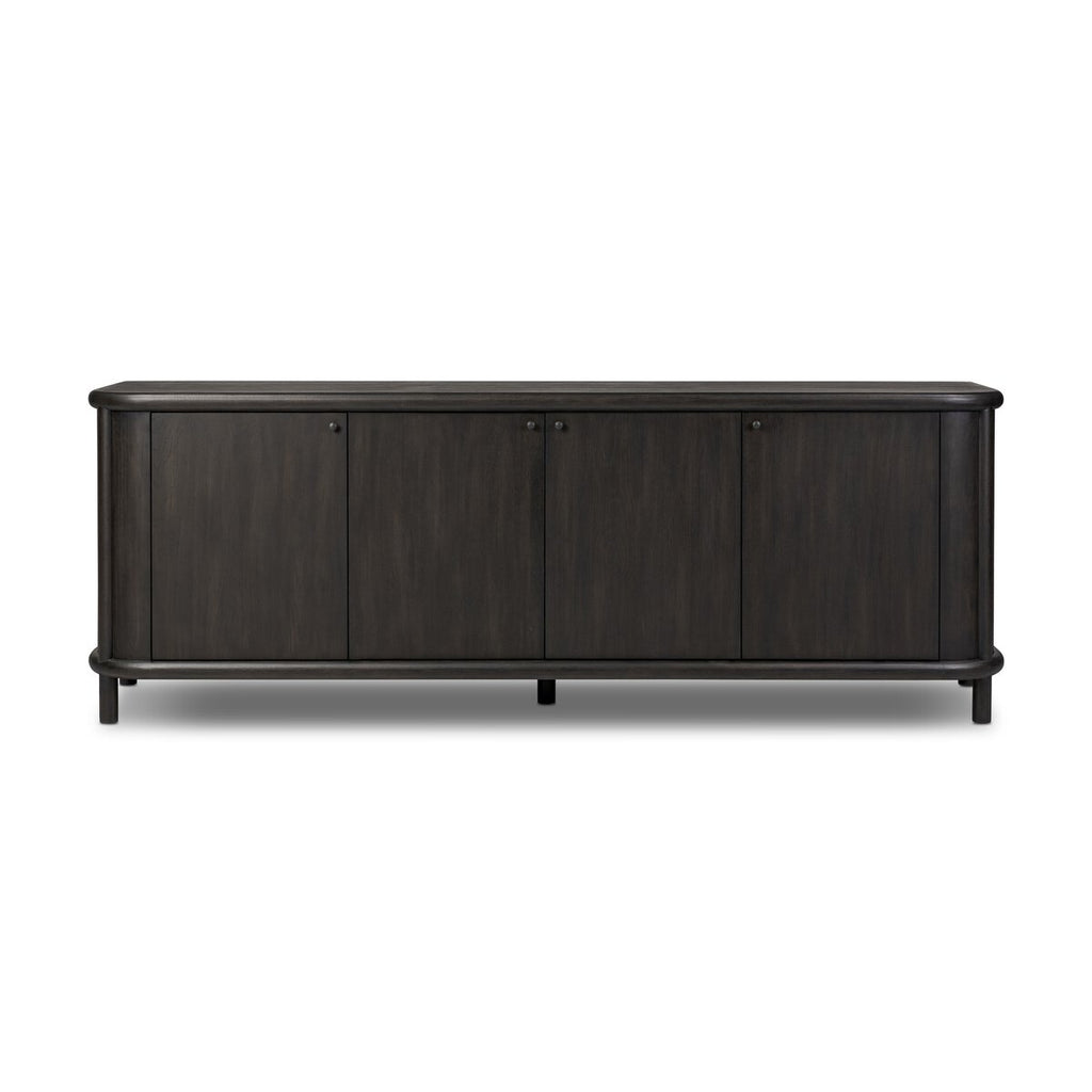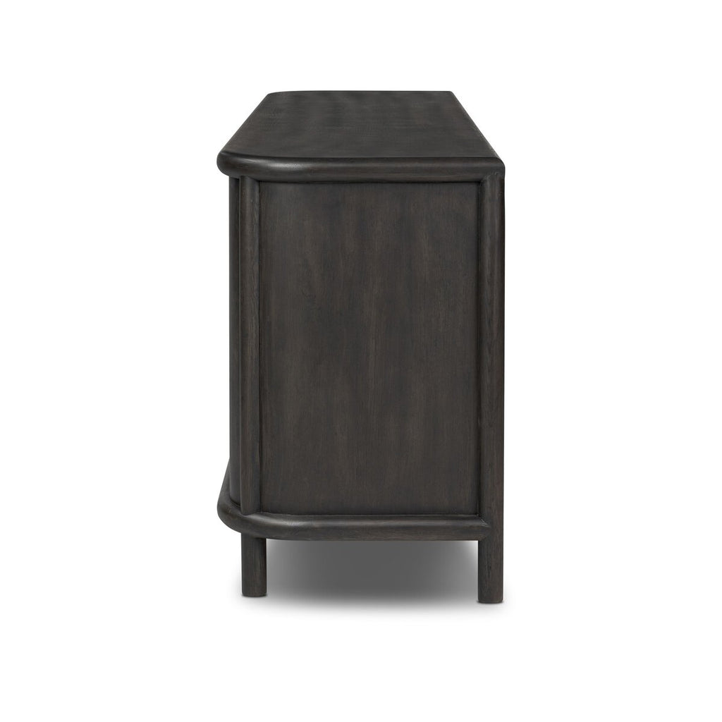 Large cylinder framework defines this oak sideboard with a warm oak finish. Curved lines add softness, while delicate hardware provides a visual contrast against the sideboard's substantial size.