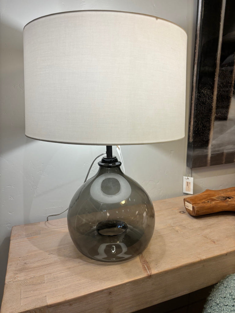 This handmade artisan table lamp is handblown glass and each is unique. Smoke glass topped with a linen shade.